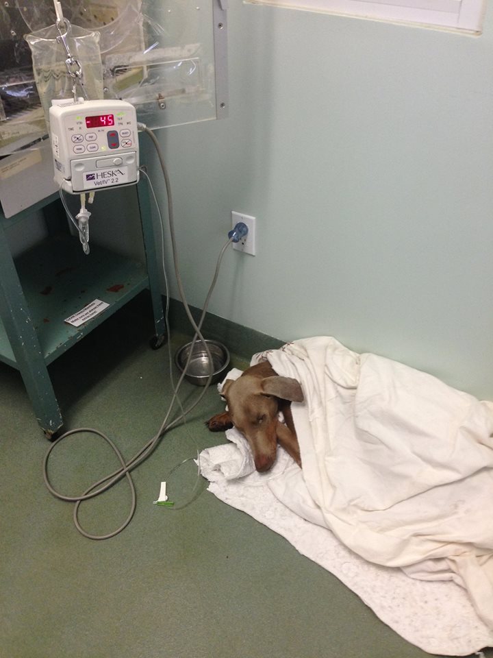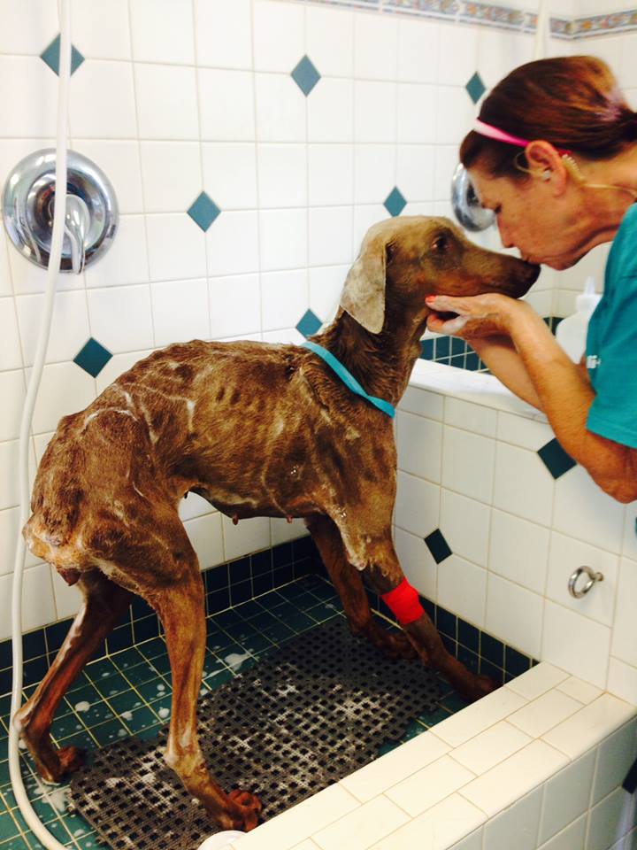 Mia, a full grown three year old Weimaraner, curls up in a corner of the shelter, to weak and scared to move. A full grown Weimaraner should weigh in around 70 pounds, Mia arrived at the shelter emaciated, dehydrated and weighing only 36 pounds.